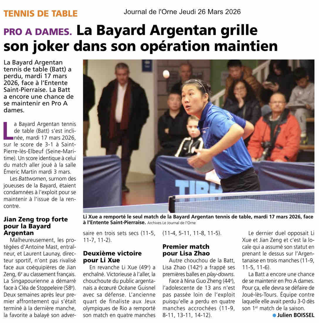 Lien : https://www.ouest-france.fr/sport/tennis-de-table/argentan-bayard-tt/tennis-de-table-pro-a-dames-playdown-argentan-domine-le-mans-en-ouverture-8773f9b6-f6e9-11ef-949f-63632bc5ac37